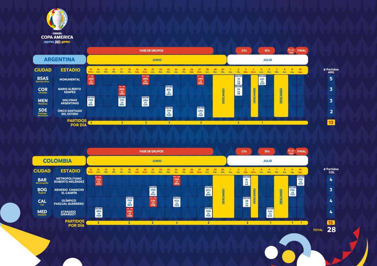 La Conmebol confirmó hoy el calendario de la Copa América Argentina- Colombia 2021 luego de la reprogramación de partidos por las ausencias de Australia y Qatar, que finalmente no jugarán como estaba previsto.