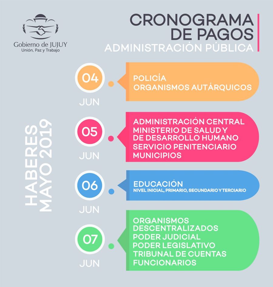 Tesorería de la Provincia anunció el cronograma de pagos de haberes netos para los empleados de la administración pública provincial y municipal por el período correspondiente a mayo de 2019, que se concretará desde el martes 4 de junio hasta el viernes 7.