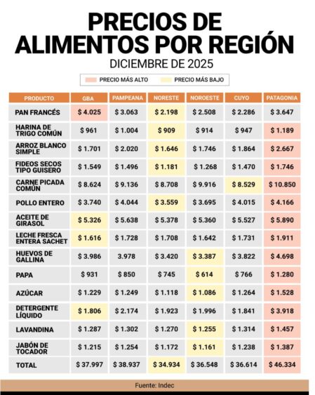 Las diferencias de precios entre las regiones del país siguen siendo marcadas y se reflejan con claridad en el costo de los alimentos básicos. De acuerdo con un relevamiento del Indec, existe una brecha del 33% entre la región más económica y la más cara al momento de comprar una misma canasta de productos en supermercados y comercios.
