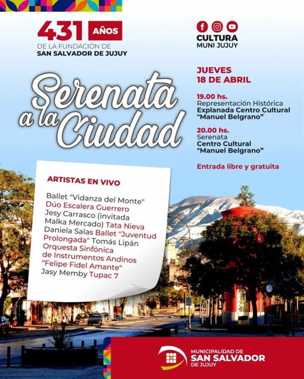 Al respecto, el director general de Cultura, Joaquín López, expresó, “estamos llevando adelante la tradicional Serenata a la Ciudad, que homenajea estos 431 años de la fundación de nuestra ciudad de San Salvador de Jujuy, con una propuesta artística que involucra a actrices, actores, músicos, músicas, bailarines, etc., con el objetivo de que todos los vecinos y la gente que nos viene a visitar pueda disfrutar y conmemorar este día como una fecha importante para nuestra ciudad”.