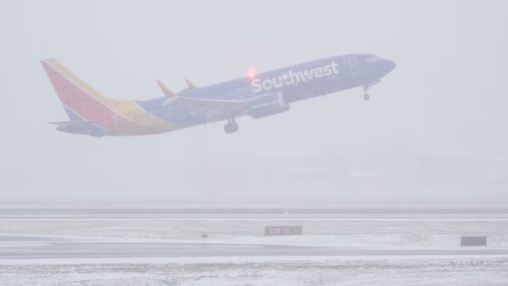 Un avión de Southwest Airlines despega en medio de una nevada (Associated Press/George Walker IV)