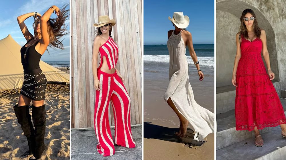 La tendencia coastal cowgirl también tuvo lugar: solero off-white de gasa arrugada, cuello halter trenzado y sombrero cowboy en tono neutro. El combo conjuga rusticidad, playa y lujo relajado. Las joyas plateadas y el maquillaje tenue sostienen la estética sin romper la armonía del conjunto.