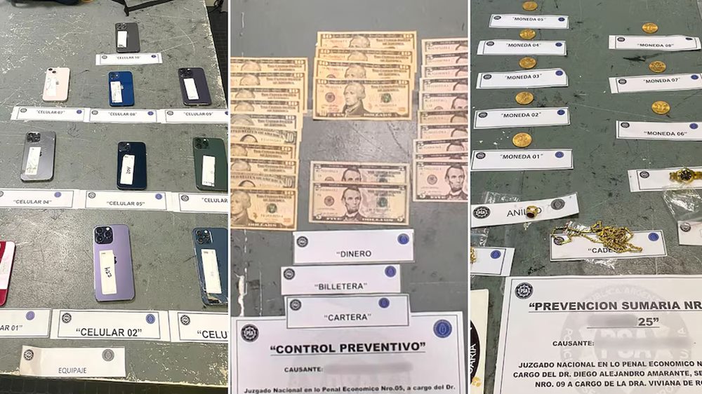 El hallazgo se produjo durante el control de equipajes por escáner, que detectó imágenes irregulares en sus valijas. Al abrirlas, los agentes encontraron relojes de lujo, joyas de oro y plata, monedas, accesorios de alto valor y diez teléfonos celulares, todo en cantidades consideradas incompatibles con un uso personal.
