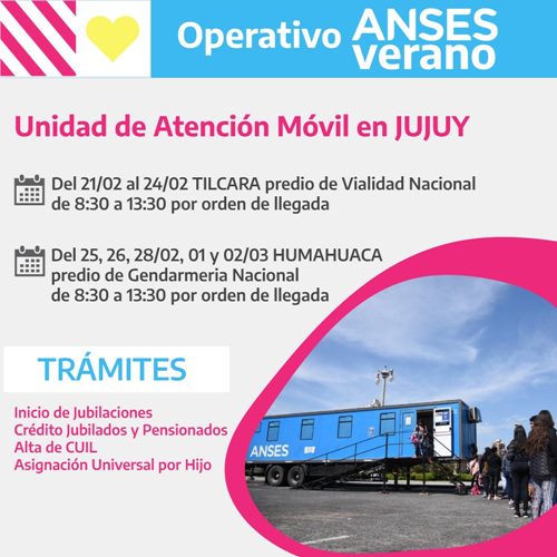 Chaher informó que la unidad móvil del ANSES acerca sus prestaciones desde hoy lunes 21 y hasta el 24 de febrero en la ciudad de Tilcara en el predio de Vialidad Nacional de 8:30 a 13:30 horas. Mientras que desde el 25 de febrero hasta el 02 de marzo se ubicará en la ciudad de Humahuaca en el predio de Gendarmería Nacional de 8:30 a 13:30 horas.