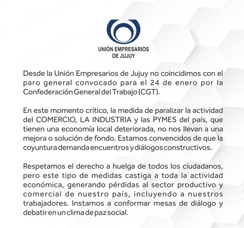 Le entidad empresaria emitió un comunicado fijando su posición ante la medida de fuerza.