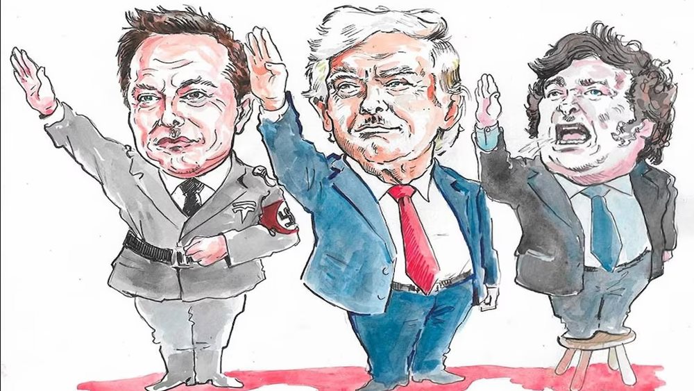 Musk, Trump y Milei haciendo el saludo nazi, una de las obras expuestas en Santa Rosa