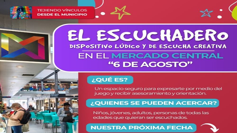 El programa municipal, El Escuchadero llegará al Mercado Central 6 de Agosto, pensado para brindar contención, asesoramiento y orientación al público en general; niños, jóvenes adultos de todas las edades, que quieran ser escuchados. El espacio estará disponible de 9 a 12 horas para comenzar a tejer vínculos desde la propuesta municipal.